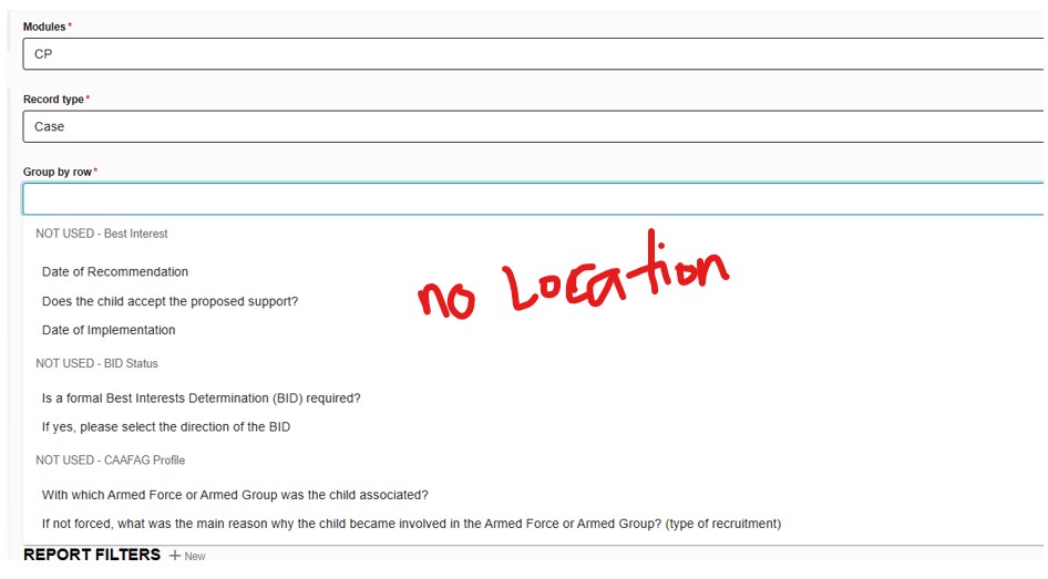 I try to create new report but both group by row or by column there is no option for location even on Report filter +new, as screenshot attached